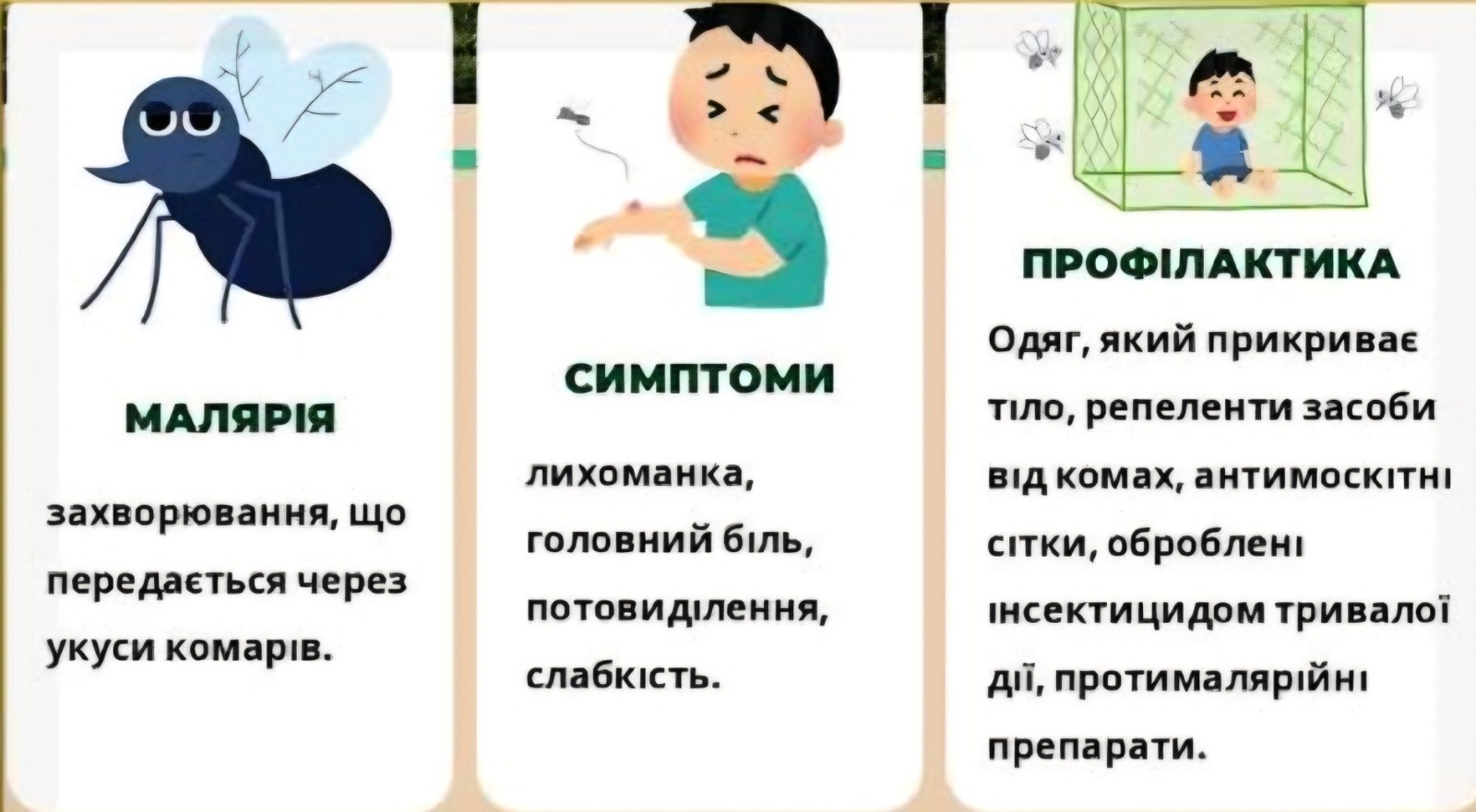 ПРОФІЛАКТИКА ХВОРОБИ – ЗАСТОСУВАННЯ ПРОТИМАЛЯРІЙНИХ ПРЕПАРАТІВ І ЗАХИСТ ВІД УКУСІВ КОМАРІВ!