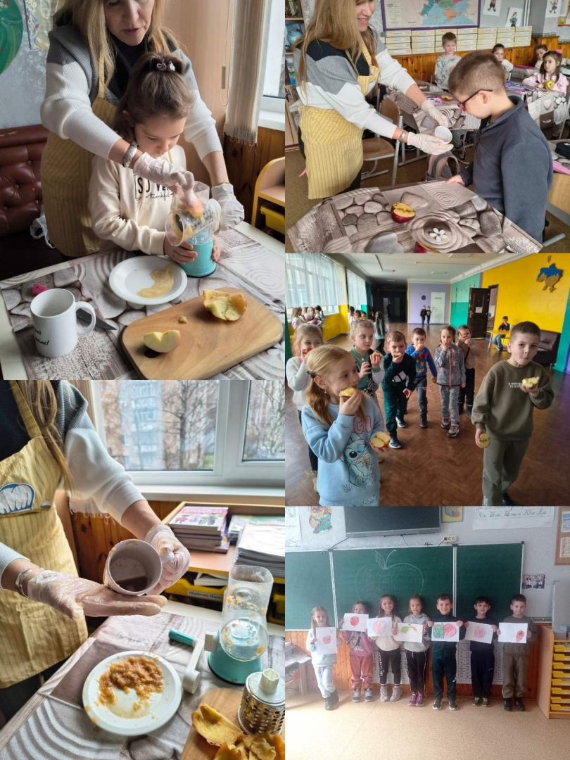 Вони досліджували яблуко , проводячи прості експерименти з хімії, біології та математики : ділили яблуко, аналізували його структуру, рахували насінини, спостерігали за зміною кольору, вичавлювали сік, а також говорили про користь і поживну цінність. Згадали й найулюбленіші страви